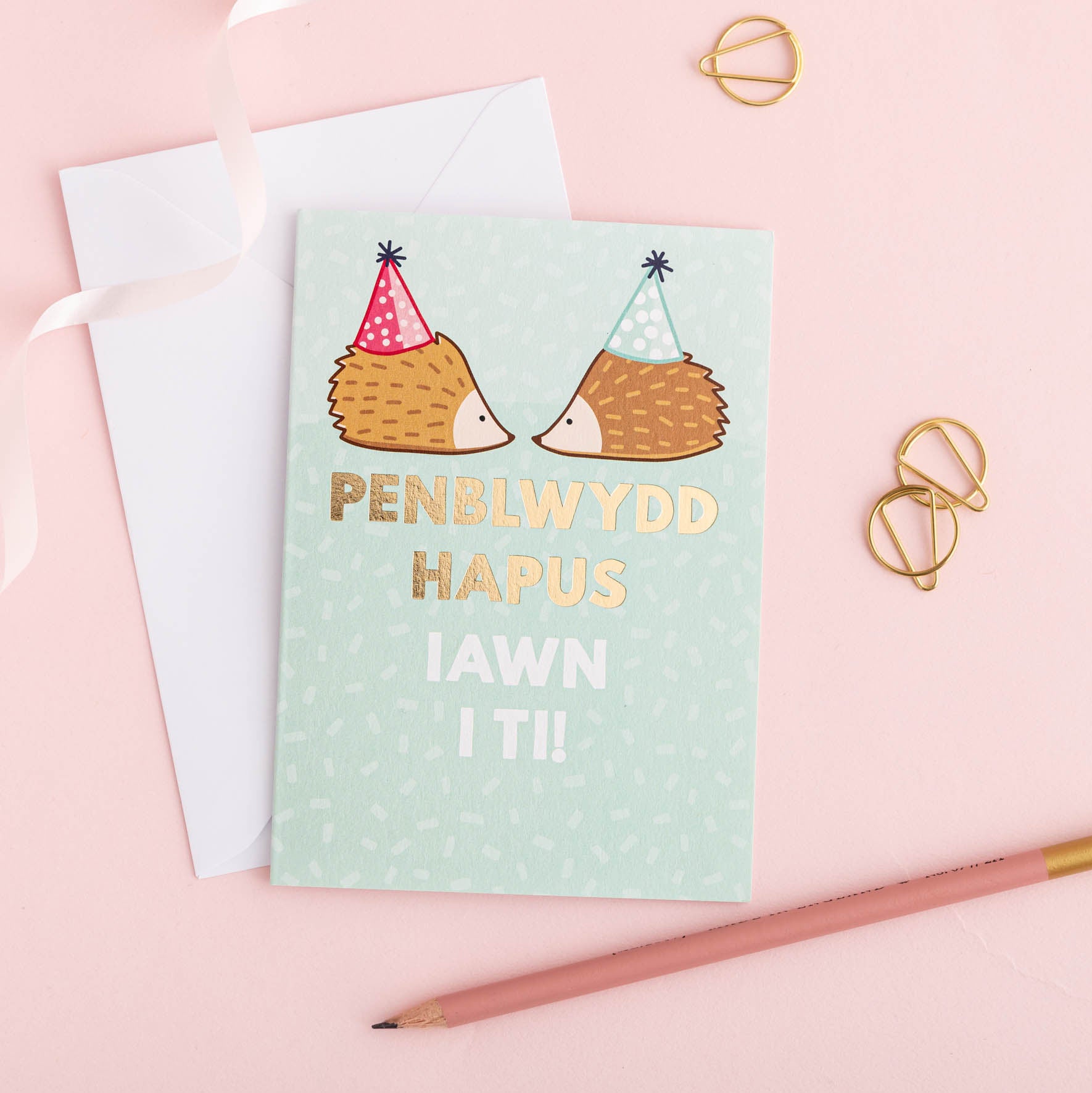 A colourful birthday card featuring bold text and hedgehogs. 'Penblwydd hapus iawn i ti' is Welsh for 'A very happy birthday to you' and is finished with gold foil.